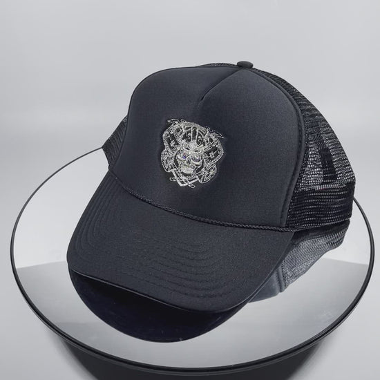 Black Hat, Metallic Silver Embroidery with Rhine Stones